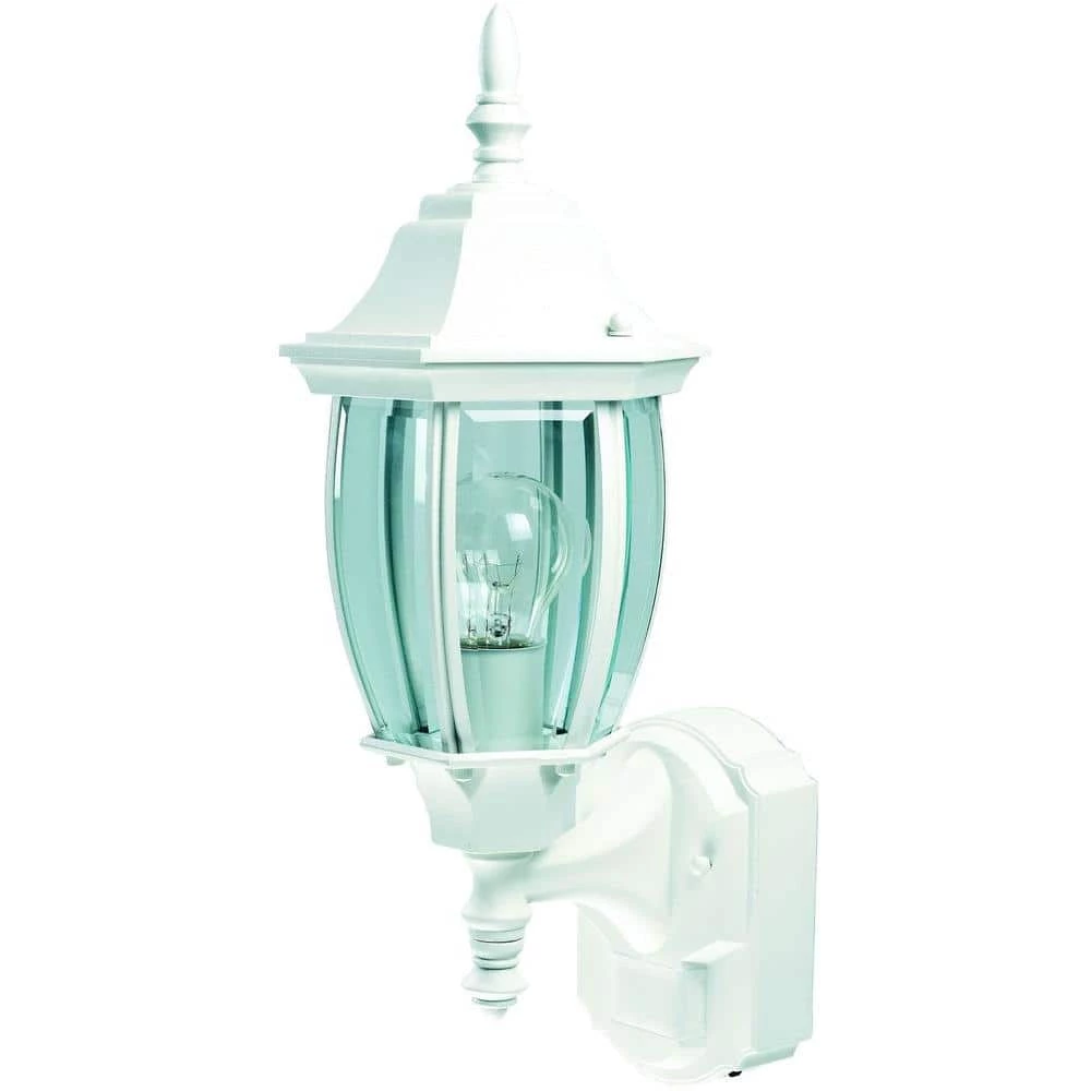 Enhance your porch, driveway or entryway with this 180 Degree White Alexandria Wall Lantern Sconce. With a white finish, the weather-resistant fixture creates a vintage feel, making it compatible with different exteriors. DualBrite technology offers a half bright lighting mode for selected time intervals, and the motion sensing feature turns on full bright if the 180-degree motion sensor detects movement up to 30 ft. away. The lantern style and beveled glass panels add decorative charm to your space.