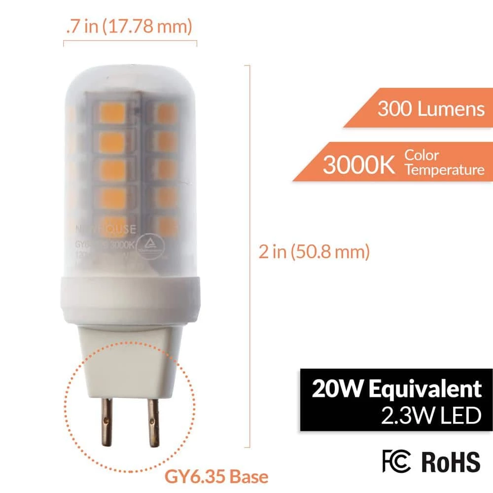 - Features: GY6.35 base LED bulb, 2.3-Watt (20-Watt equivalent), 120-Volt, energy-saving
