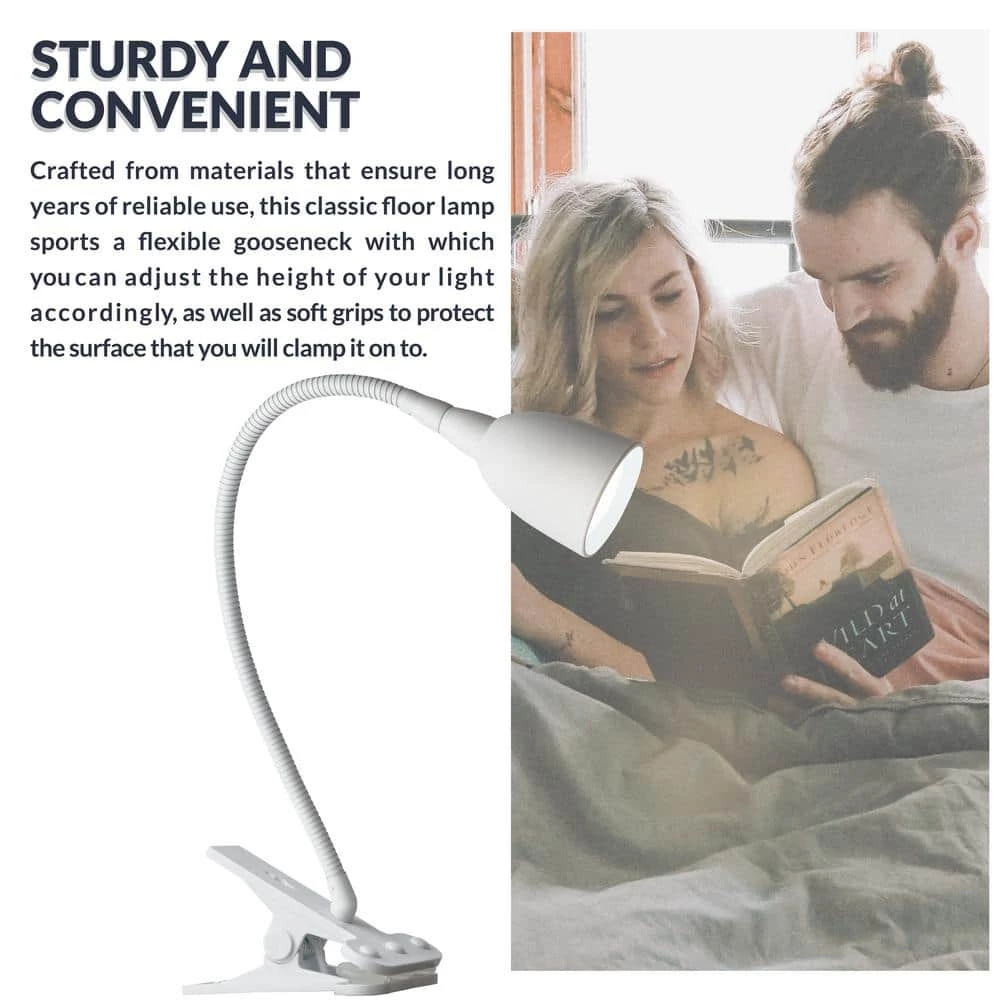 - Sturdy, convenient, and simple: crafted from materials that ensure long years of reliable use, this classic floor lamp sports a flexible gooseneck with which you can adjust the height of your light accordingly, as well as soft grips to protect the surface that you will clamp it on to