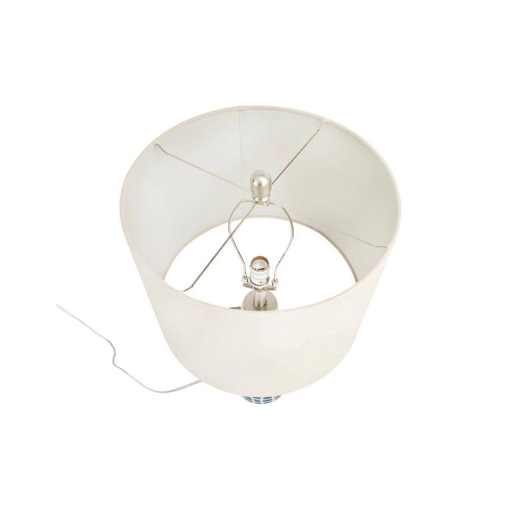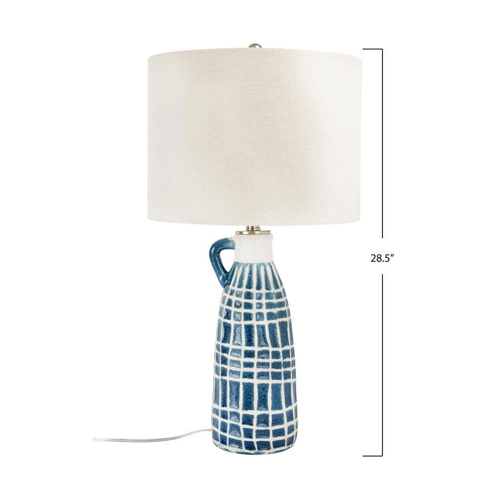 Truly unique and perfect for the country decor, this blue table lamp has distinctive character not often seen. With a small handle on one side, the deep blue finish is divided by a carefree embossed grid pattern. Pair with a blue throw and decorative pillows nearby.