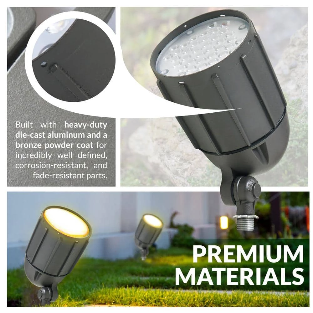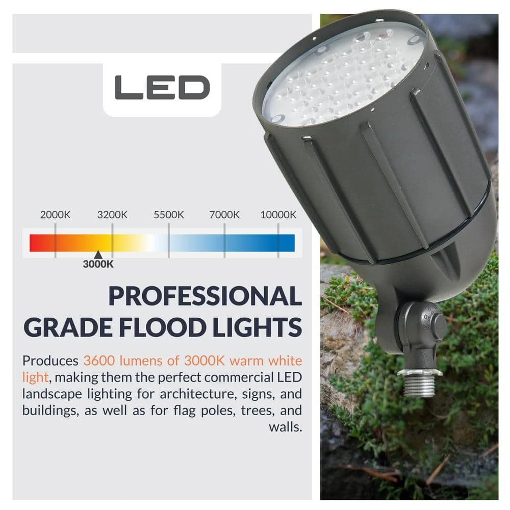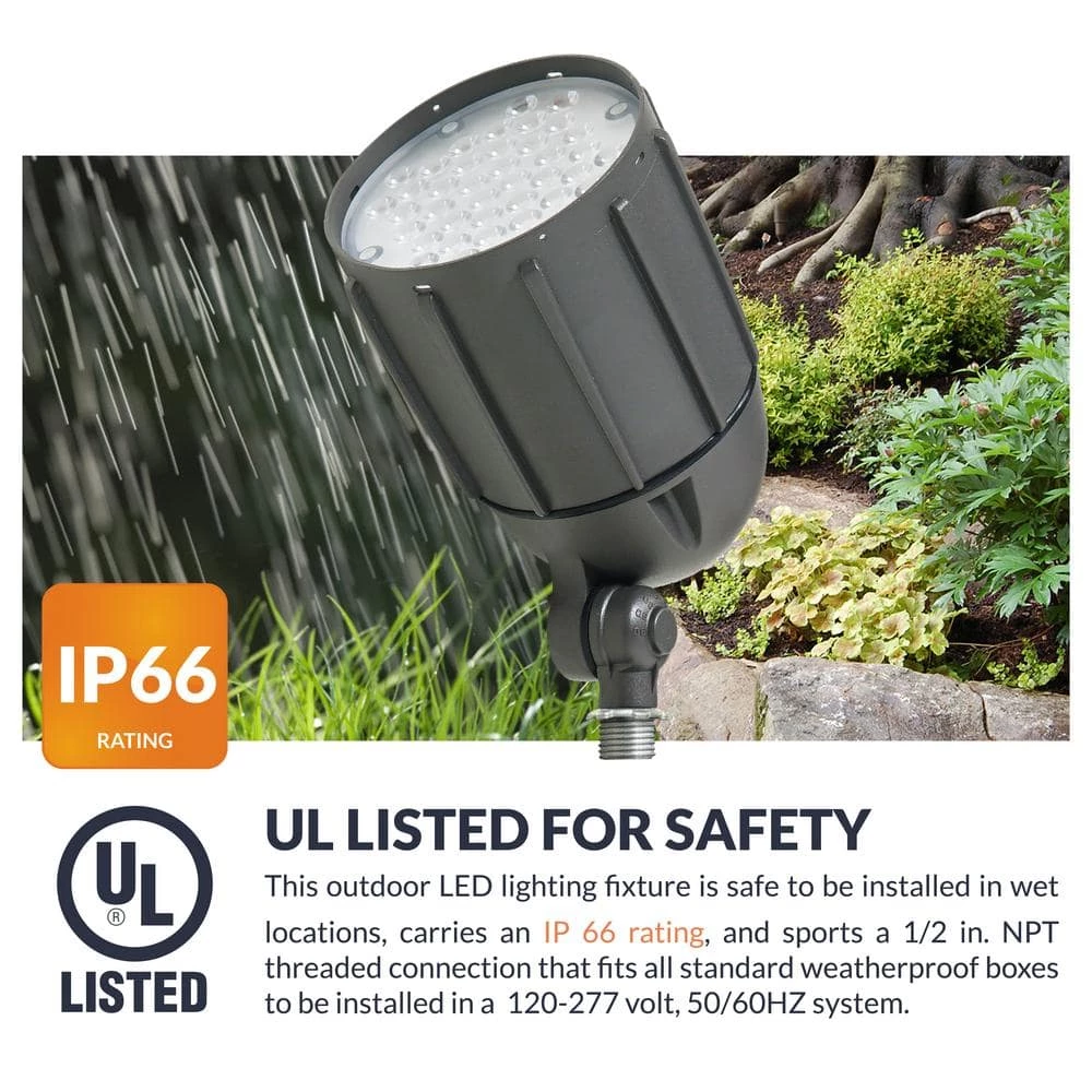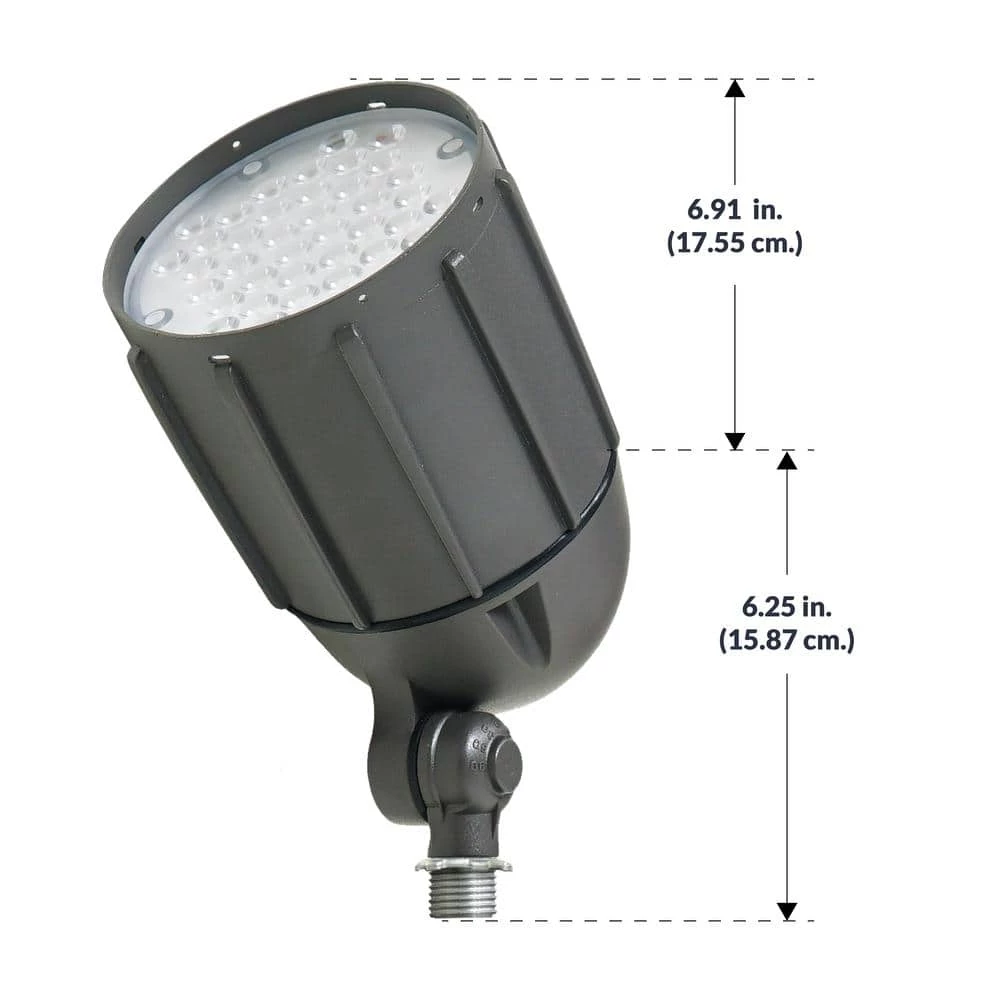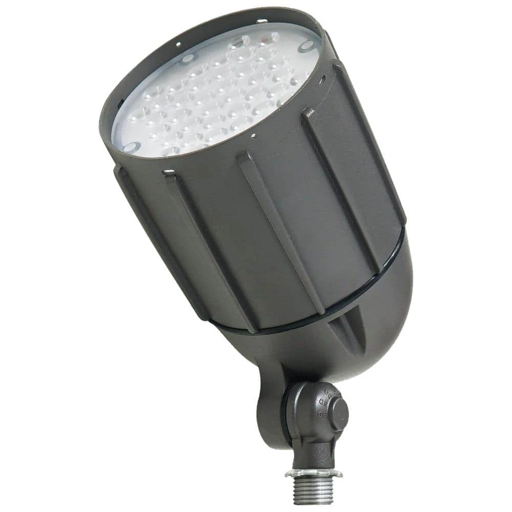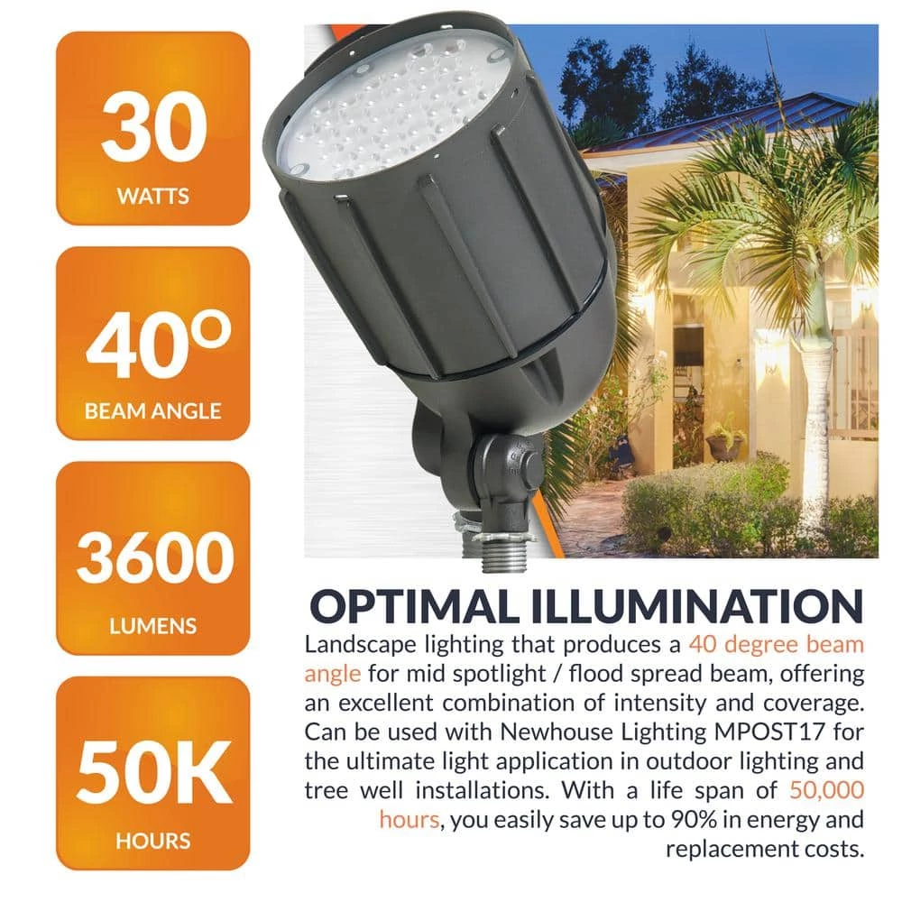 Get energy-efficient, heavy-duty outdoor illumination with our Integrated Outdoor LED Weatherproof Bullet Flood Light with Adjustable Mounting Bracket. The 30-watt high-lumen non-dimmable LED bulb casts a high-powered beam of warm light equivalent to 175-watt incandescent flood light in strength and coverage. That makes it the ideal LED outdoor light for yards, walls, signs, gardens, and landscape lighting. It’s fixed to an adjustable mounting bracket that lets you direct the light exactly where you need it. It mounts securely to 1/2-in. weatherproof boxes. Illuminate the outside of your home at night with the warm glow of 3000K Soft White LED flood lights outdoors. This powerful lamp comes with a frosted lens, has a beam angle of 40 degrees, and lasts 20 times longer than a halogen flood light bulb. This outdoor lighting product is housed in heavy-duty, die-cast aluminum with a rust-resistant bronze finish. You can get powerful lighting for practically no maintenance or very little attention. The 3600-lumen LED flood light bulb is rated to last for 50,000 hours of use. That means you could potentially use it for up to 22 years and yet only rack up an estimated energy cost of $7.23 per year. Get powerful and energy-efficient lighting for 90% cost savings against halogen lamps. Get your Newhouse Lighting 30W Bronze Integrated Outdoor LED Weatherproof Bullet Flood Light today and refit all of your home landscaping with beautiful, energy-saving illumination.