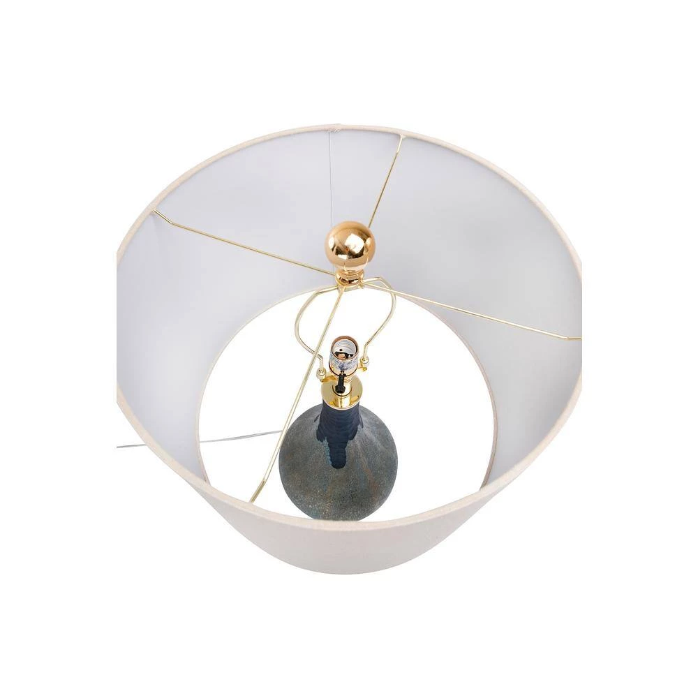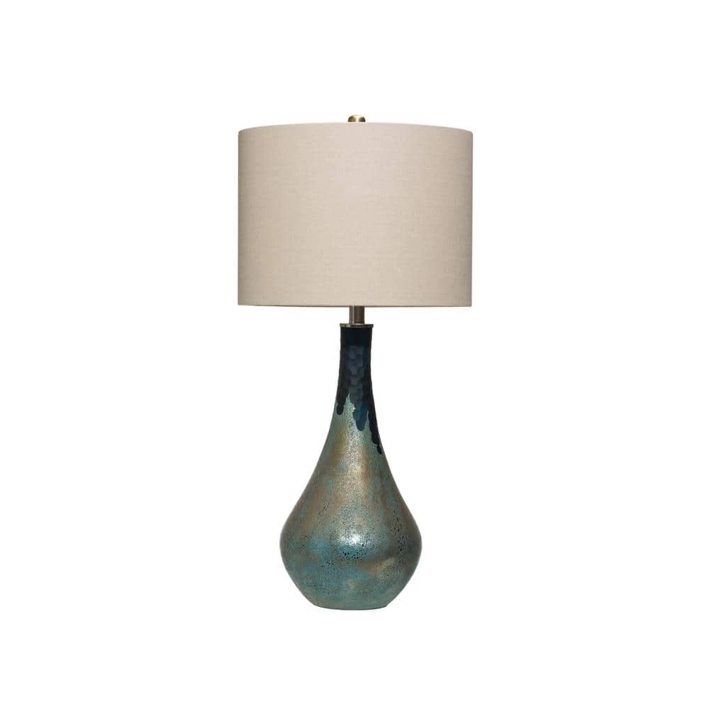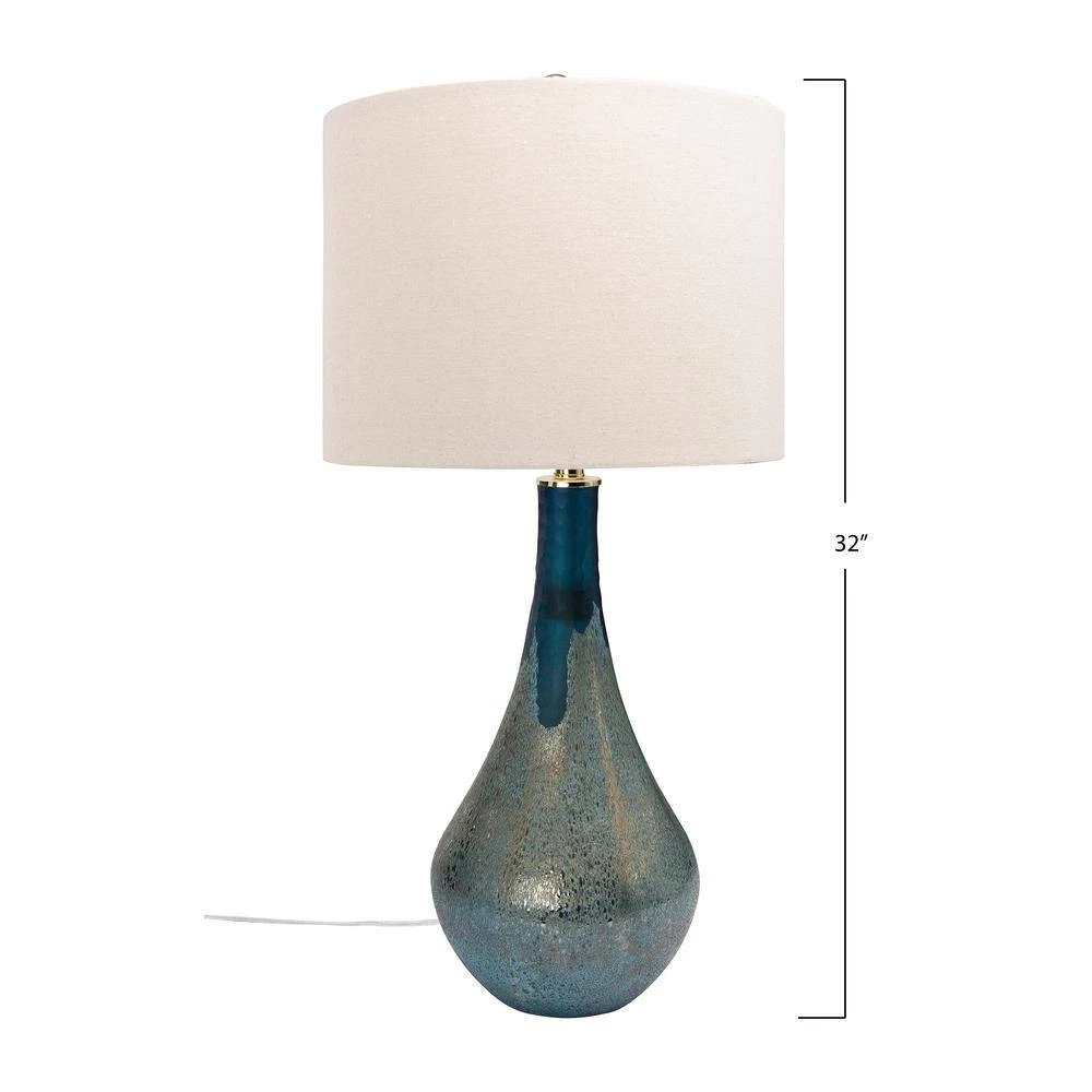 Shades of blue and green mingle with an opal finish creating images in the mind of a tranquil Caribbean ocean. The color and texture of the embossed neck, melt into the body of the lamp creating a piece that is unmatched. This lamp will add luxurious elegance to any room decor.