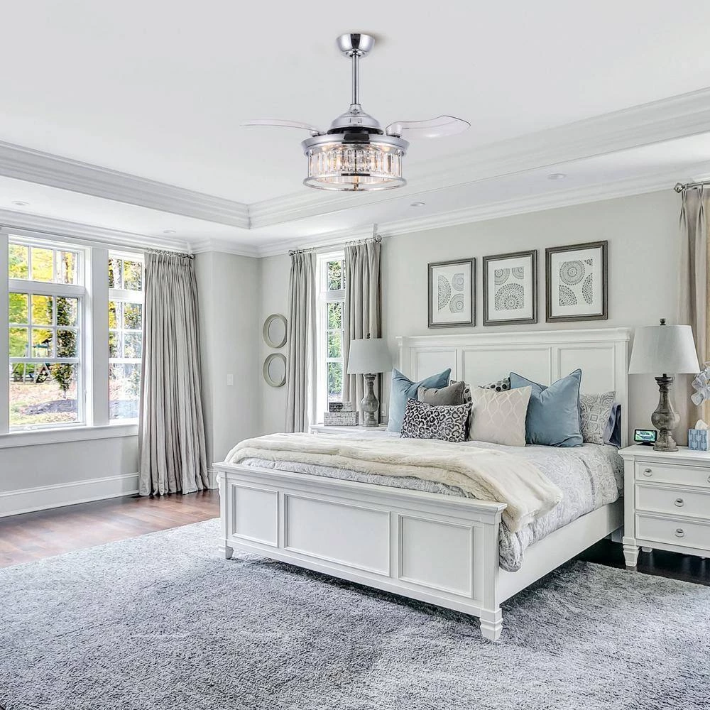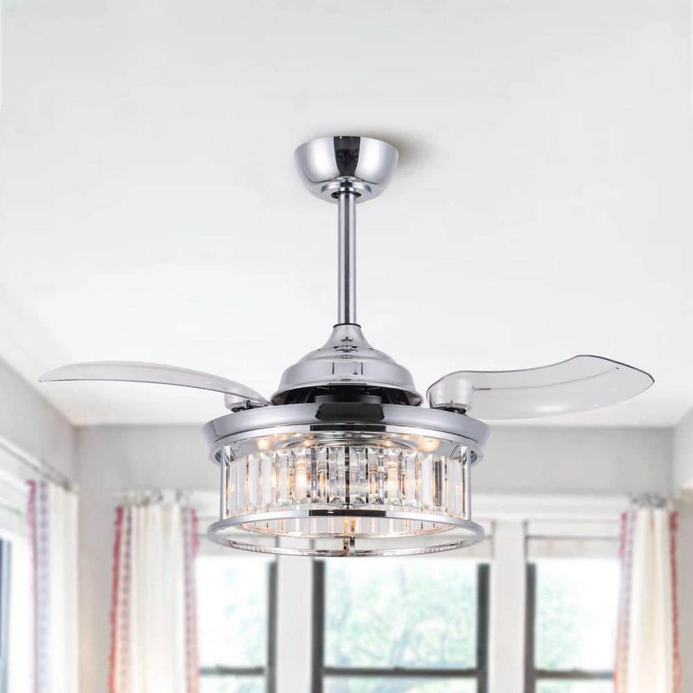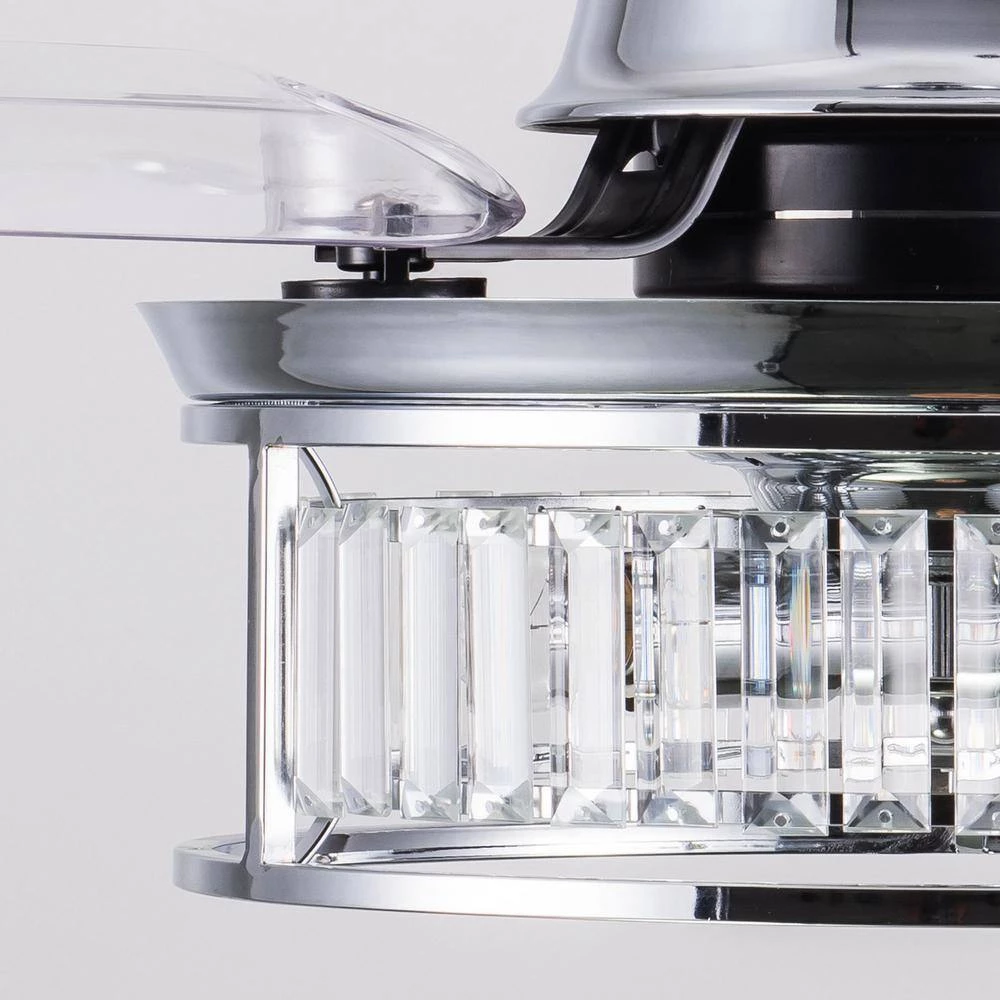 Advanced ceiling fan with unique aesthetics and energy-efficient design. Switched off, the traditionally intrusive fan blades automatically retract and conceal, transforming the unit into a modern pendant. It creates open space in the room environment, accumulates less dust, and is unobtrusive and versatile to visually integrate into all rooms of your home. The fan comes with 3-speed remote control and a down rod-mount for you to personalize your experience. The warm light reflecting though the shade is sure to add that designer look to any room in your home.