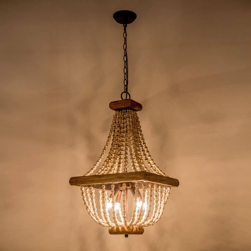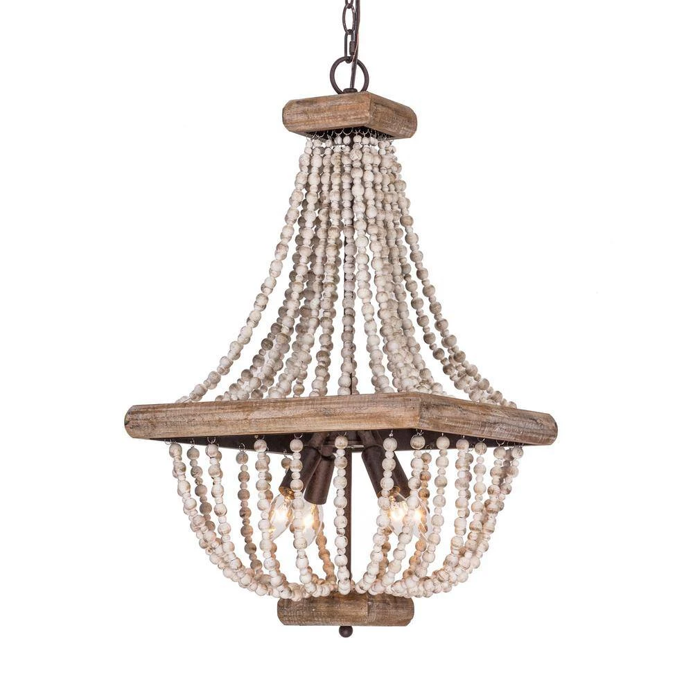 Make a statement as you shine a light over any space with this distinctive 4-light chandelier. It is crafted from wood in a rustic brown finish. Strands of wooden beads in an airy cream finish cascade from the top to offer up a touch of natural style, making this design right at home in a cottage, modern farmhouse and industrial arrangements alike.
