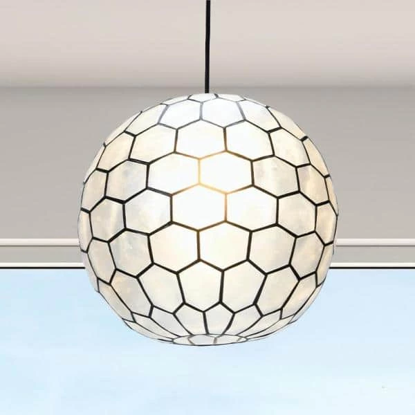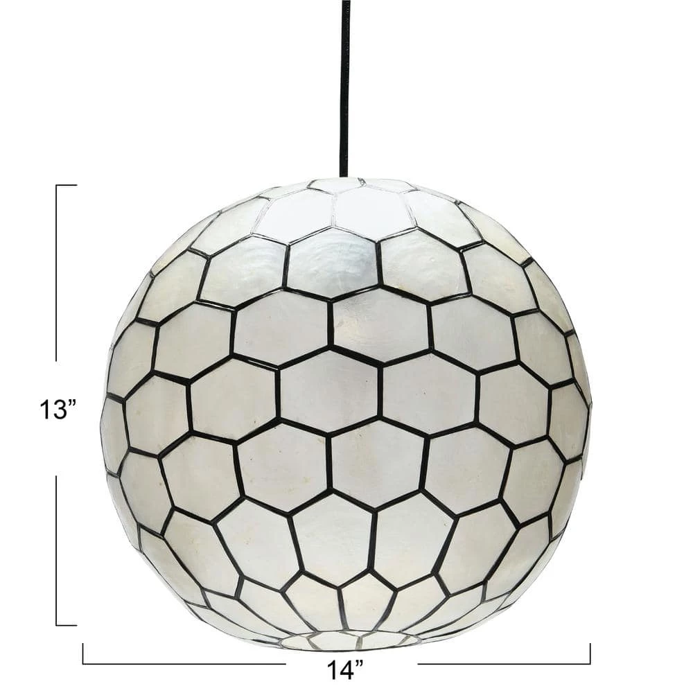 - Striking round ceiling light is handcrafted with pearlescent Capiz seashells framed in a metal honeycomb pattern