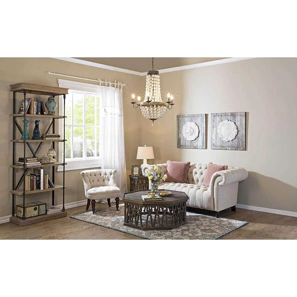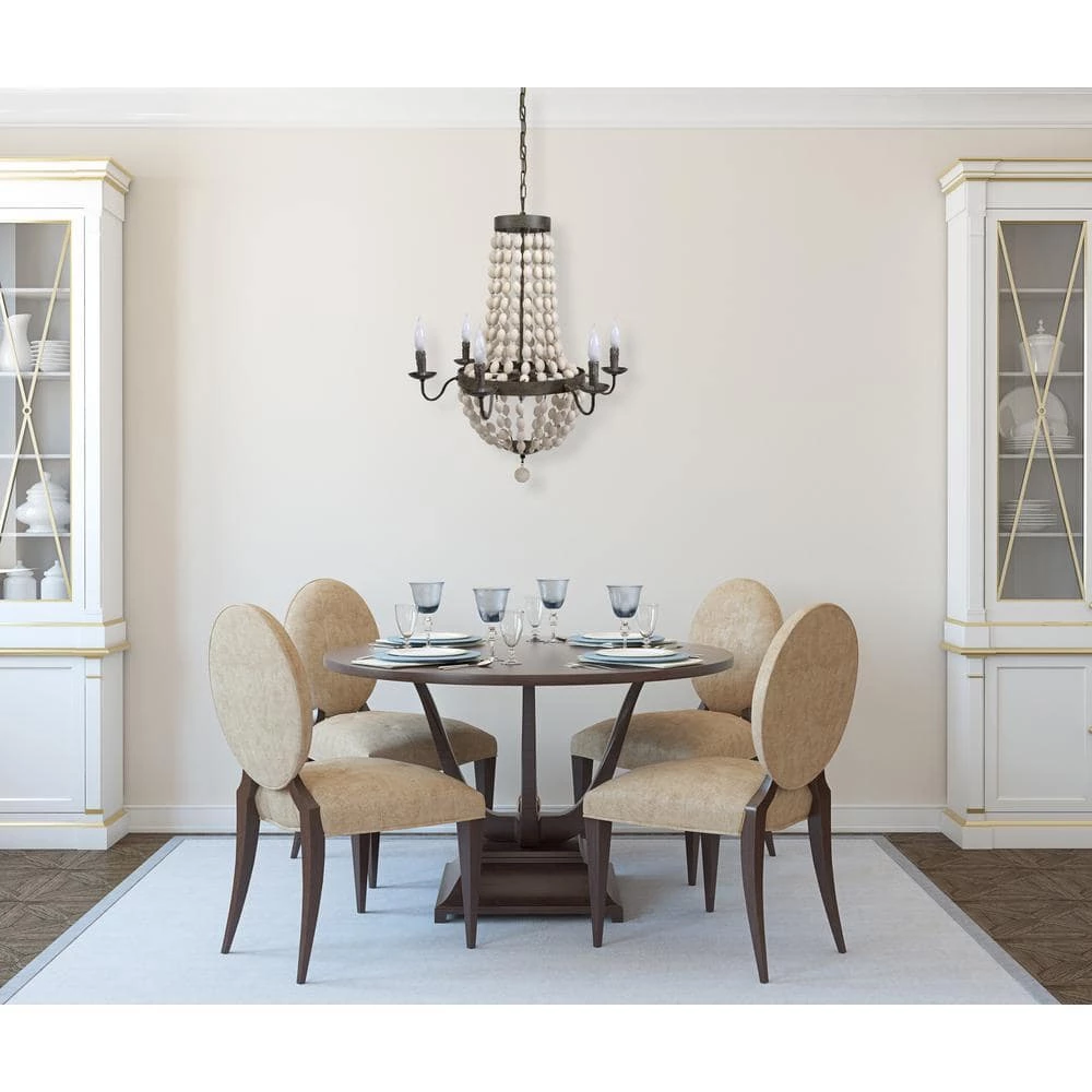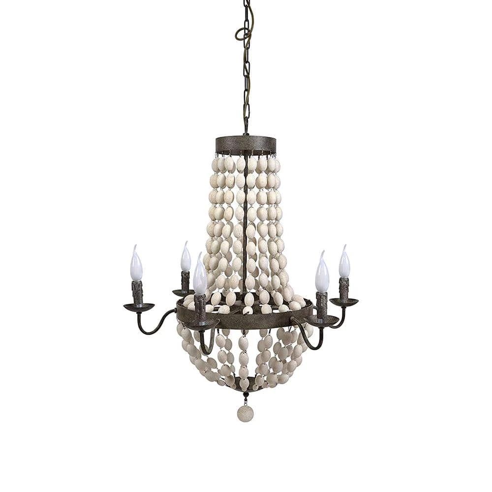 The Metal Chandelier comes with wood beads. It has a durable metal and wood construction for long-term use. This chandelier can be hardwired or plugged in to serve your needs. For care and maintenance, simply wipe clean with a dry cloth. It requires six 40-Watt bulbs.