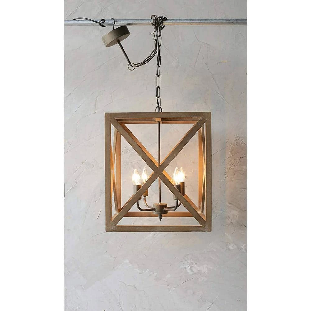 The Square Chandelier has a metal and wood construction for long-term use. The natural finish adds a touch of elegance and suits a wide range of decor. It requires 25-Watt bulbs.