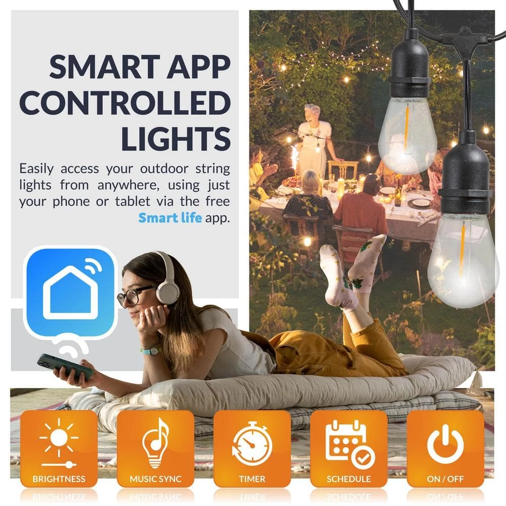 - Smart app-controlled lights: easily access your outdoor string lights from anywhere, using just your phone or tablet via the free Smart Life app, you can sit back and enjoy the added convenience and efficiency of being able to dim the brightness, set up automatic timers and lighting schedules, or just simply turn your lights on and off, all without having to get up or install a light switch