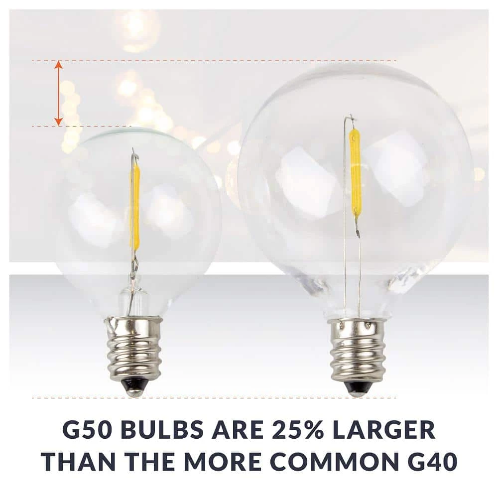 - Extra-large G50 globe string lights: make your outdoor lighting stand above the rest with our unique G50 LED outdoor lights these G50 globe lights have a larger bulb diameter than the more common G40 bulbs, and they emit more light too